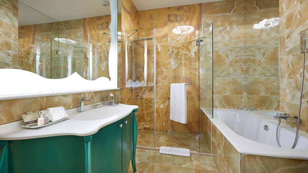 Spend the night with dreams of Madame Butterfly, Carmen, or Salome when you select an Opera Suite. Reserve an Opera Duet Suite with a King bedded room plus Opera Parlora with a dining table and pantry, or add room with 2 Full Beds to make a Trio Suite which can comfortably accommodate a family of up to 6-8 people including 2 or more children, depending on the ages of the children. As a one bedroom suite enjoy 666 Square feet or 61m2. The stunning onyx bath has a luxury shower stall and no tub.