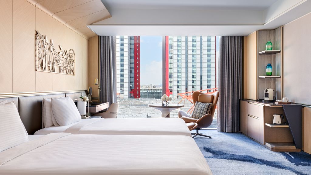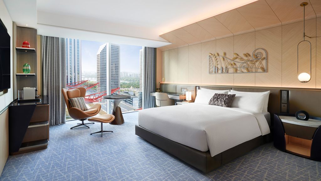 Fairmont Ambassador Seoul sits at a strategic postage-stamp address within the Parc 1 development, minutes from Yeouinaru and Yeouido stations. The hotel’s sleek high-rise form offers vistas of the river and the city skyline, merging metropolitan momentum with a sense of pause. Inside, the design references Korean tradition through bold red columns and modern glass expanses, so you feel both anchored and elevated the moment you step in.