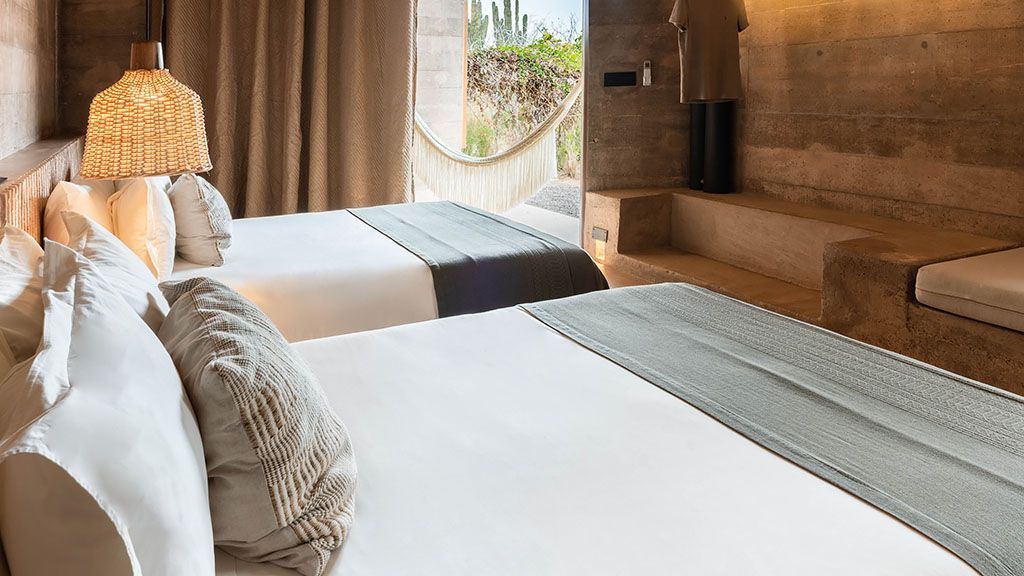 Step directly into the baja landscape from this ground-floor garden suite, where a spacious outdoor terrace and artisan-woven hammock invite slow mornings and golden desert evenings. Sliding glass doors open the room to native gardens and farmland views, creating a seamless connection between indoor comfort and the surrounding landscape. Inside, minimalist architecture meets handcrafted mexican furnishings, creating a calm retreat rooted in the textures and rhythms of todos santos. Bathrooms feature paradero’s signature indoor–outdoor showers behind perforated privacy screens. Every stay at paradero includes a curated calendar of daily guided experiences—from surf excursions and yoga classes to beach days, cooking workshops, farm activities, meditation sessions, and art walks through the colorful streets of todos santos. Ideal for travelers seeking an immersive baja experience where nature, design, and daily adventure are all part of the stay.