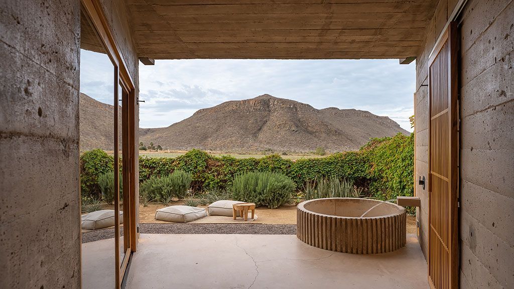 Imagine ending the day in your soaking tub, contemplating the beauty of the landscapes and listening to the sounds of the desert. Perfect for couples, this ground-floor garden suite has an expansive outdoor terrace that offers privacy and total immersion in nature. Rooms are oases of calm and serenity, balancing clean lines and natural textures with handmade mexican furnishings. Main living areas have nooks that look out to the natural scenery, while the bathrooms feature indoor-outdoor showers with perforated privacy screens. Some garden suites offer views of the farming fields while others look out to the mountainous desert.