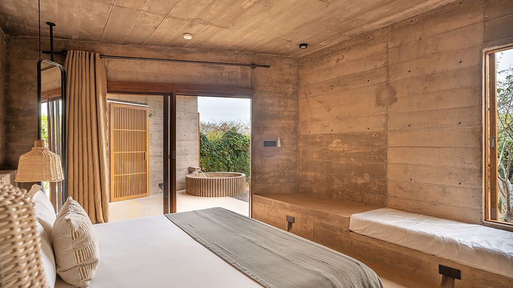 Distinguished by their panoramic rooftops, all of which have built-in suspended “star nets.” this mountain view sky suite offers high-altitude views of the surrounding farmlands and mountains, plus plush day beds and showers that open to the outdoors. On cool nights, guests can request outdoor fire pits for comfortable lounging outdoors. Rooms bring together stone surfaces, rattan accents, wood furnishings, and an abundance of light—creating a zen-like space that offers inspiration and relaxation.