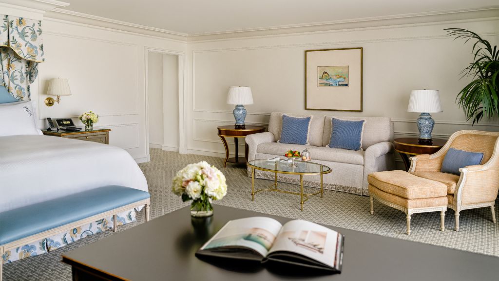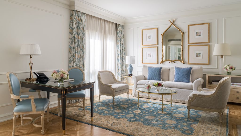 These spacious one bedroom suites offer views of the hotels gardens. Unique features include a corner balcony with a table and two chairs. Room features include a work desk with all-in-one fax/copier/printer, IDD speakerphones and voice mail. The well-appointed marble bathroom features a deep soaking tub and luxurious designer bath amenities. Bedding features a sumptuous king bed with pillow top mattress, luxury linens and a comfortable duvet. These rooms also feature accessible facilities. Room amenities include complimentary broadband and wireless Internet access, a hair dryer, mini-bar, personal safe, LCD widescreen HDTV, Blu-ray DVD player, Bose Stereo, CD Player and iPod dock. Also included are climate control, bottled water and a fruit basket. Maximum occupancy is 4 persons using 1 rollaway bed on request. All rooms are non-smoking. No connecting rooms are available for this room type.