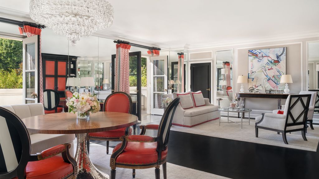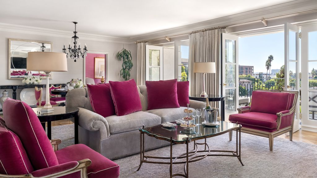 California suites offer views of the front fountain and mountains beyond or views of the hotel gardens. Added features include hardwood floors - a large living room with a dining table for four persons - a separate guest washroom - wet bar - vanity area and large closet space. Additional features include an executive desk with speakerphone and voice mail. The well-appointed marble bathroom features a deep soaking tub and separate shower cabin plus luxurious designer bath amenities and double vanities. Bedding features a sumptuous king bed with pillow top mattress - luxury linens and a comfortable duvet as well as a sofa bed. Suite amenities include complimentary wireless internet access - a hair dryer - mini-bar - personal safe - widescreen hdtv. Added amenities include climate control - bottled water - a fruit basket plus several other luxurious appointments. Included with published room rates is the use of a luxury vehicle during the duration of the guests stay subject to proof of insurance and a valid u. S.-issued drivers license. Other conditions apply to vehicle use. Contact the hotel to reserve vehicle prior to guest arrival. No connecting rooms are available for this suite type.