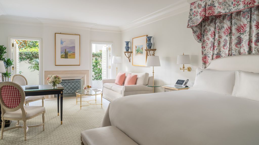 Grand deluxe rooms offer a spacious sitting area with a loveseat and coffee table - perfect for small meetings or spacious relaxation. Views are of the hotels interior gardens or residential beverly hills. Room features include an executive desk with speakerphone and voice mail. The well-appointed marble bathroom features a deep soaking tub and separate shower cabin plus luxurious designer bath amenities. Corner rooms offer double vanities. Bedding features a sumptuous king bed with pillow top mattress - luxury linens and a comfortable duvet plus a sofa bed. Room amenities include complimentary wireless internet access - a hair dryer - mini-bar - personal safe - widescreen hdtv. Also included are climate control - bottled water - a fruit basket plus several other luxurious appointments. Some of these rooms can connect to a deluxe king room.