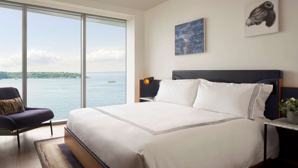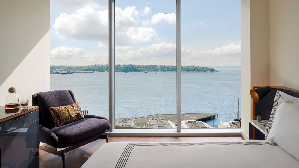 After a day of exploring Seattle, settle into the midcentury modern residential comforts of this water view room, with one king bed, waterfront views, and a rainfall shower.