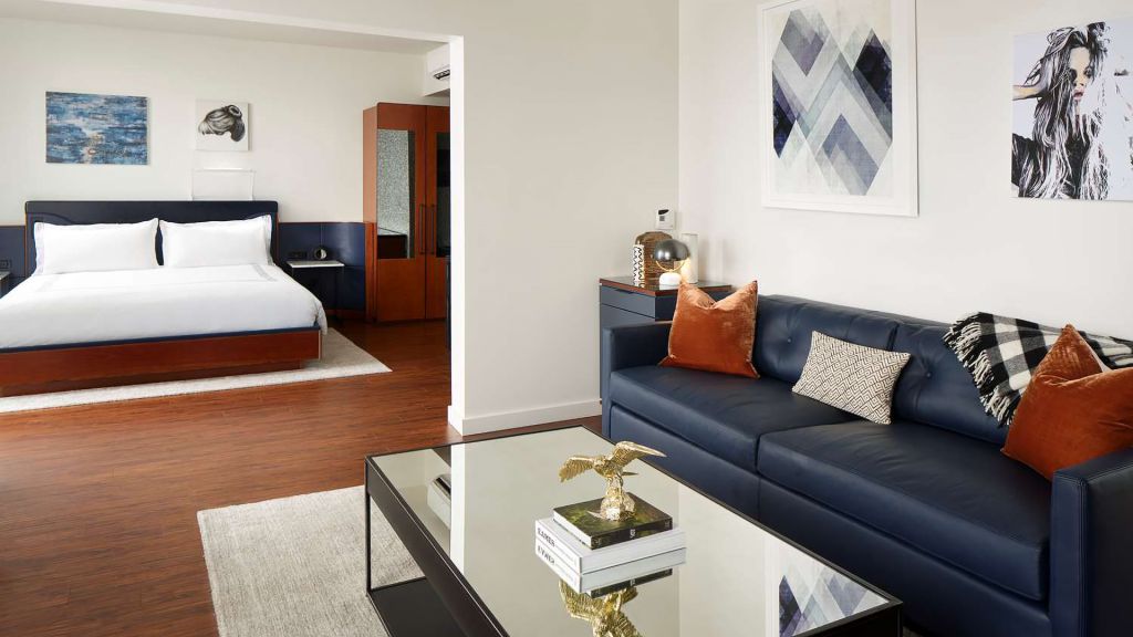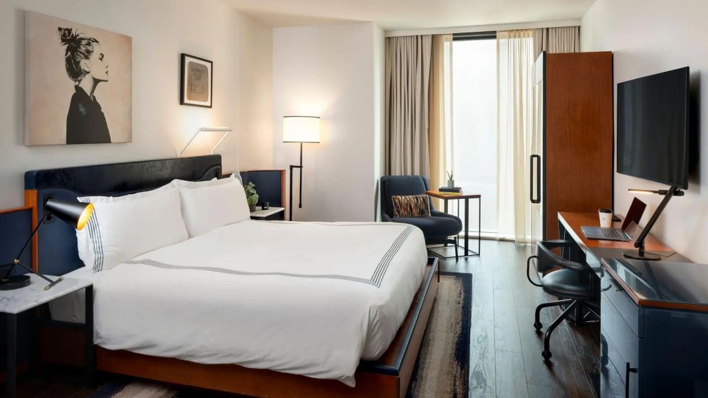 Watch the scene unfold in the hotel’s interior courtyard from this stylishly appointed room, featuring one king bed, a curated honor bar, and a rainfall shower.
