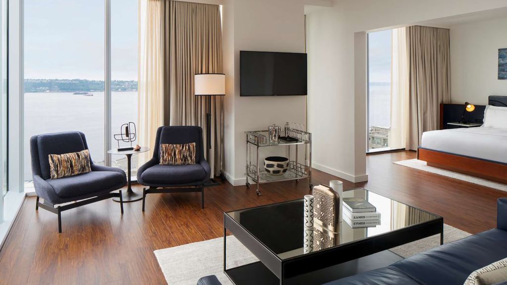 Step inside this spacious suite, where Pike Place Market views, a king bed, a separate living area, and a bathroom with rainfall shower make this space perfectly suited for entertaining friends.