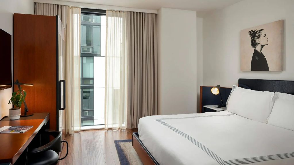 Daylight flows in through floor-to-ceiling windows overlooking downtown Seattle’s vibrant Stewart Street in this accessible city view hotel room — fully equipped with a king bed, midcentury modern furnishings and a roll-in shower.