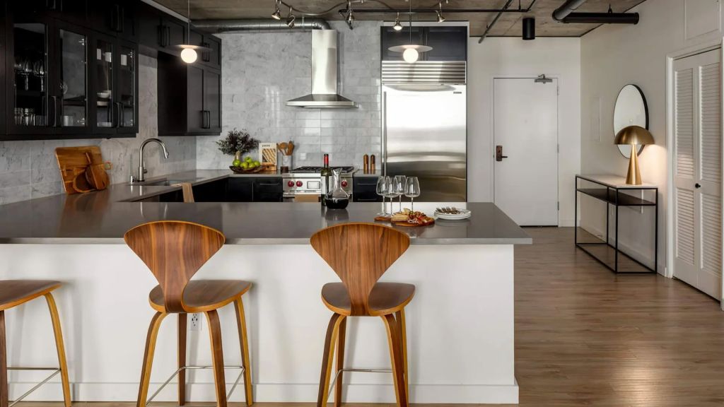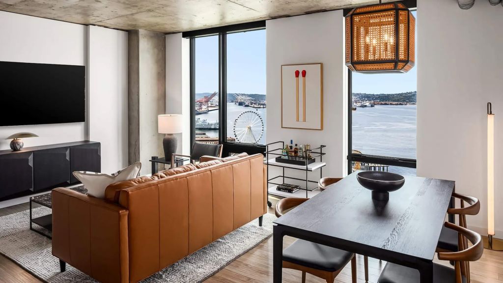 Experience luxury living at its finest with this large one-bedroom penthouse boasting sweeping views of the Olympic Mountains. A curated gallery of local artwork and remarkable downtown Seattle views enhances the unique midcentury modern space. The penthouse is outfitted with luxurious residential comforts, including a full kitchen, spacious living and dining areas ideal for entertaining, a sleeper sofa, a main bathroom with a rainfall shower and a one-and-a-half-bathroom.