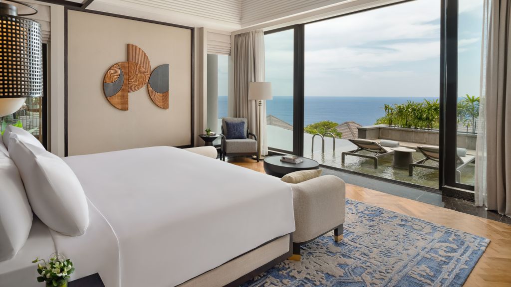Surrounded by lush green landscapes and partial ocean views, this one-bedroom villa offers a secluded retreat for a truly relaxing getaway. The elegantly designed interiors include floor-to-ceiling windows and sliding doors for maximum light and space. The bedroom presents one king bed with a 55-inch TV and the comfortable living room includes a second 65-inch TV. The bathroom offers a deep soaking tub and a rain shower. Enjoy 115 sq. m. of furnished outdoor space, including sunbeds and a dining area. Standout amenities include a private infinity pool, a hot tub, and an outdoor rain shower to stay refreshed. Additional amenities include complimentary WiFi, an espresso machine, minibar, pillow menu, bathrobes and slippers, and safe. Sleeps 2 adults and 1 child with a rollaway bed.